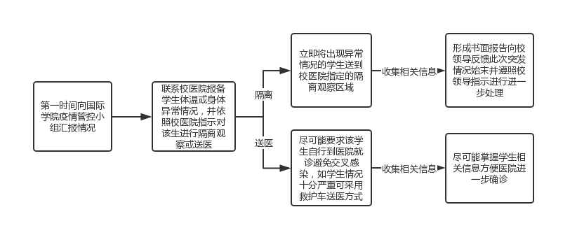 首先确认学生生理体征状况,如发现体征异常,须要求学生到医院确认是否感染病毒,对于无明显体征异常的学生,应安排隔离观察。