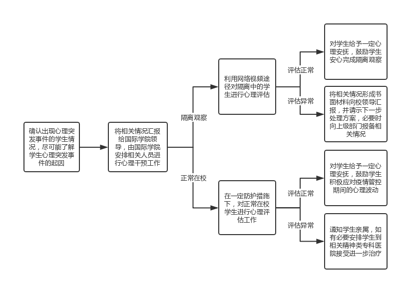 留学生普遍对疫情存在恐慌心理,因此在疫情防控期间学生很可能出现各种心理突发状况,此类事件属易发生的疫情间接类突发事件。在处理此类事件过程中,应及时向学校防控领导小组汇报进展情况,必要时还要向上级部门汇报。